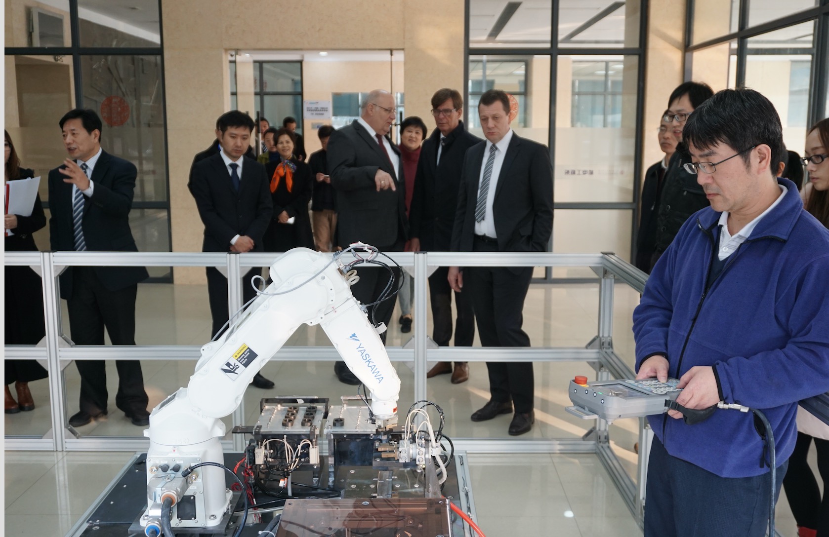 11月29日,德國萊比錫工商業(yè)聯(lián)合會(IHK)主席Kirpal先生及總經(jīng)理Hofmann博士來到江蘇,首先參觀我方和德國bbw教育集團的中德合作項目-江蘇無錫公共實訓基地的bbw學習型工廠,對我們完全按照德國標準設計規(guī)劃的教學場地以及嚴格貫徹德國雙元制教學大綱和實訓標準的教學過程表示贊許,在看到項目學生加工出的作品之后,更是豎起大拇指,表示這才是“德國標準”的高技術人才。